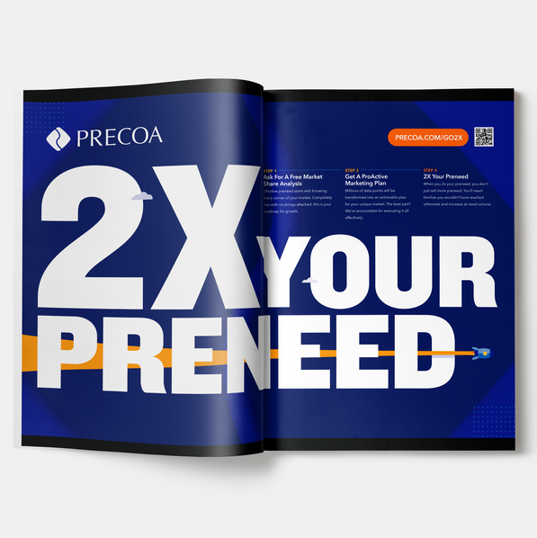 A published magazine that hit the mailboxes of hundreds of funeral homes throughout the country. The goal was to emulate our 2X Preneed & Beyond campaign message with the rocket ship being a key symbol. Using the combination of Precoa's brand, testimonials, infographics, and vector illustrations we were able to create a piece that was well-received throughout our prospective partner landscape. The magazine helped inform some marketing materials for a national convention as seen below.